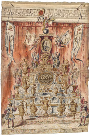 Para la siguiente jura, la de Luis I, que tuvo lugar en julio de 1724, la indumentaria de los participantes y de los miembros del ayuntamiento fue más sencilla, pues los trompeteros y los timbaleros se vistieron de paño de grana de Holanda, con franjas de oro y con las armas de la ciudad bordadas49. No obstante, por la conservación del testimonio manuscrito, el tablado levantado por el gremio de plateros y los carros del paseo que organizaron fueron espectaculares (figura 9)50. La jura de Fernando VI fue recogida en la relación festiva de José Mariano de Abarca, quien hizo una descripción muy minuciosa de todo lo que rodeó a los festejos51. El programa iconográfico para la ocasión se centró en el paralelismo entre el sol y la luna y Fernando VI y Bárbara de Braganza52, respectivamente. Se plasmó en los tres tablados levantados por los artistas Francisco Martínez y Juan de Espinosa, que los adornaron con escudos de los reinos, alegorías de las partes del mundo y estatuas alusivas a seis planetas, que remitían al séptimo planeta, figurado en el retrato del monarca. Además, frente al palacio, se construyó un arco de triunfo de tres cuerpos, decorado con pintores de la Antigüedad, como Apeles y Timantes, y emperadores romanos53. Para la jura de Carlos III, que se celebró el 25 de junio de 1760, hay pocas noticias de su lucimiento, aunque sabemos que solo el alférez real se gastó la suma de 40 000 pesos.