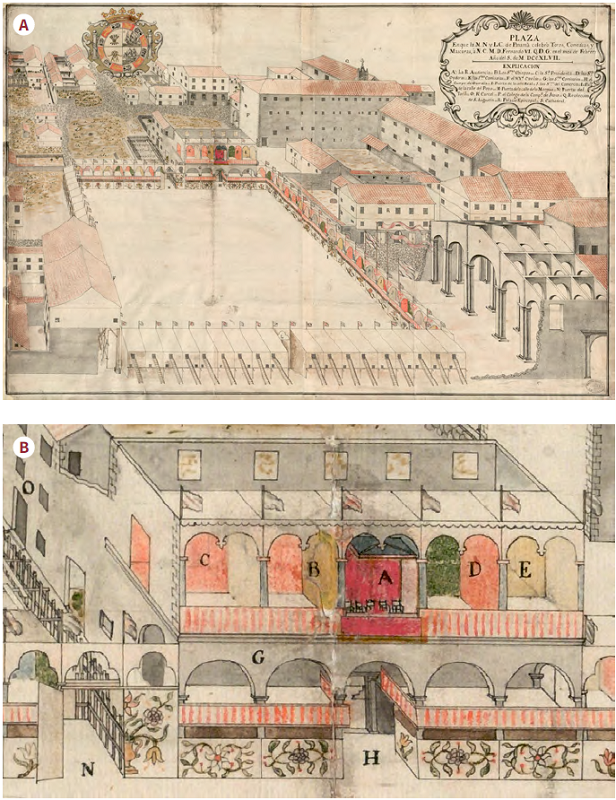 Sin lugar a dudas, una de las modificaciones más relevantes de la plaza fueron el arte efímero y sus adornos. Pese a no ser las únicas, destacaban tablados y cercados como espacios multifuncionales. Un dibujo de la plaza Mayor de Panamá (figura 1) muestra una amplia estructura para la corrida de toros y otras diversiones durante la jura de 1748. Allí, además del espacio distribuido y jerarquizado para las corporaciones (según su cartela), se admira en el detalle que la obra posee cenefas, flores pintadas, gallardetes y banderas de diversos tamaños. A esto debemos agregar los balcones de las casas del cabildo y la del alférez real, adornados con colgaduras de terciopelo y damasco62. La figura panameña nos ayuda a imaginar, aunque de menor tamaño y lujo, el cercado hecho en la villa de San Gil en 1760. Para tres días de toros se mandó “guarnecer” la plaza y adornarla con una cenefa pintada de azul y verde cuyos lienzos midieron 694 varas63.