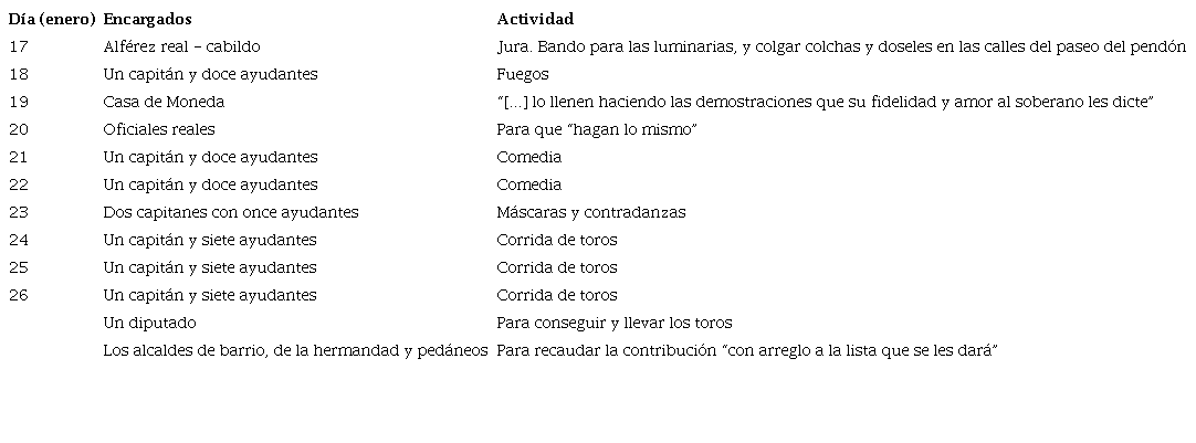 La labor de los diputados era fundamental. No era poca cosa la coordinación de uno o varios días de fiesta. La amplitud de los componentes de la celebración permite destacar los artefactos y las funciones que comúnmente fueron objeto de reparto. Además del ejemplo de la tabla 1, y aunque el abanico de actividades podía ser más amplio, los preparativos de la jura de Fernando VI en Cali (1747) muestran otras funciones: fuegos, luminarias, marchas, mojigangas, juego de cañas, toros, alboradas y comedias24. Una lista de esta índole requería una gestión para cada actividad y costos que podían llegar a sumas elevadas -solo los “fuegos” costarían más de 500 pesos-. La distribución de la logística y el costo de todo ello es, quizás, una de las dimensiones más interesantes de la preparación de la fiesta.