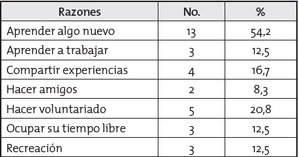 El interés en participar en procesos de formación, motivado por el deseo de querer aprender algo nuevo, ratifica que el sujeto envejece tiene las mismas o mayores posibilidades de seguir aprendiendo y replantear su proyecto de vida, con lo que se desmitifica la sobrevaloración del trabajo como proyecto de vida, al igual que el proceso de envejecimiento (Dornell, 2014), tomándolo como un proceso para optimizar oportunidades de participación, salud y seguridad que mejoren la calidad de vida (Zunzunegui y Béland, 2010). Estos resultados contrastan con los obtenidos en el estudio de Yuni y Urbano (2005), que igualmente indagó los motivos para participar en actividades educativas y obtuvo como mayor resultado el de deseo de mantenerse activo física e intelectualmente y, con un menor puntaje, de aprender cosas que sirvan para mejorar la situación personal o algún otro fin particular.
