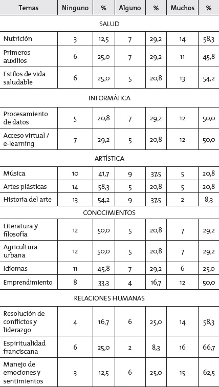 Con respecto a los temas de mayor interés, los trabajadores en proceso de prejubilación están inclinados por temas de salud, informática, relaciones humanas y emprendimiento, dato de especial significación para las investigadoras, pues en la bibliografía que trata esta temática Yuni y Urbano (2011) encontraron diferencias en los tipos de conocimiento considerado, pues, por un lado, se interesan por conocimientosinstrumentales, para trabajar y ganar dinero, y conocimientos para la vida, que se apropian a partir de la reflexión, el encuentro ínter e intrageneracional y la vivencia, frente a lo conocido académicamente, en el que además existe un tiempo diferente, que es productivo, útil y significativo y aquel tiempo existencial, en donde se llega a la autocomprensión, al fortalecimiento de la autoeficacia percibida, al encuentro de su sentido de vida. Estos conceptos hacen la diferencia, al plantear unas estrategias de formación como parte de un plan de retiro, pues no se deberán generar programas o cursos de formación permanente de la misma manera, como se hace en los programas de pregrado y quizás de posgrado, sino de manera que el tiempo y el conocimiento sean pautados por individuos que ya han vivido experiencias valiosas y tienen motivaciones diferentes para aprender o incursionar en el mundo académico, razón por la cual están implicados más valores personales y espirituales que aquellos que motivan a ganar dinero o mantener un nivel de vida, ya alcanzado en todo su trasegar laboral.