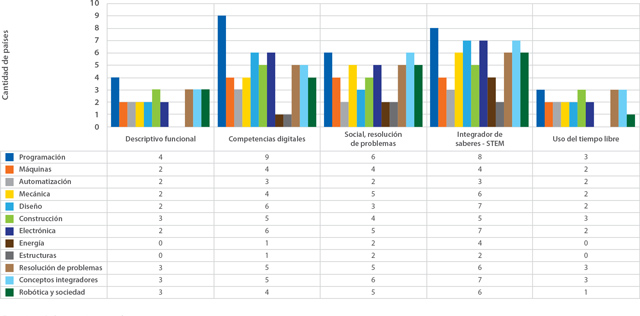 Cabe señalar que la mayoría de las naciones dan tratamiento a varios enfoques, ya que su uso integrado otorga relevancia a la robótica en el campo educativo y permea todos los grados de escolaridad, bien sea como herramienta, como complemento del área de tecnología, o independientemente. Además, se observa que es una apuesta que hacen los gobiernos, entidades privadas y universidades para la formación de profesores y jóvenes, puesto que tras sus investigaciones se detecta un aumento y mejora del proceso de aprendizaje contextualizado y de las capacidades individuales, que se integran a diversas áreas del conocimiento con habilidades y relaciones eficientes con la tecnología y la sociedad (Alimisis et al., 2017, pp. 179-188; Heiner, 2018; Khine, 2017, caps. 1-2; Štuikys, 2015). Así pues, la inspección presentada afianza el hecho de que es deseable para el mundo asumir un enfoque multidimensional de la robótica en su implicación con el proceso formativo.