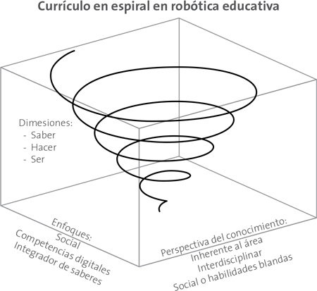 El modelo curricular en espiral aquí propuesto, basado en el ideado por Bruner (1988), se plantea en tres ejes: ancho, largo y en profundidad, donde el primero se refiere a los enfoques (social, competencias digitales e integrador de saberes), que surge de la necesidad de afrontar la robótica; el segundo hace alusión a las perspectivas del conocimiento (inherentes al área, interdisciplinar y social), que son las temáticas que puede abordar; y el último, que corresponde a las dimensiones del saber, hacer y ser, que son las competencias de aprendizaje para la solución de situaciones a partir de las habilidades y comportamientos. Esto se evidencia al estar relacionados y ligados todos los ejes entre sí, ya que giran en consonancia, en pro del aprendizaje centrado en el estudiante, como se evidencia en la Figura 4.