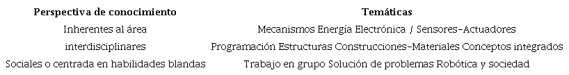 Por consiguiente, después de hacer una revisión y análisis para los contextos internacional y nacional del estado de implementación de la robótica -en los que se establecieron los enfoques y conceptos que se manejan mayoritariamente y se revisaron varios casos de estudio que se concentran en diseñar un plan de estudio para una población específica-, y comprendiendo la importancia de la tecnología en la educación colombiana, se propone que su enseñanza debe partir de la integración consciente y estructurada de los enfoques: social, competencias digitales e integrador de saberes, a partir de tres perspectivas de conocimiento: 1) inherentes al área, 2) interdisciplinares y 3) sociales o centrados en habilidades blandas, como se muestra en la Tabla 3, donde se presenta una clasificación de las temáticas a partir de las tres perspectivas mencionadas.