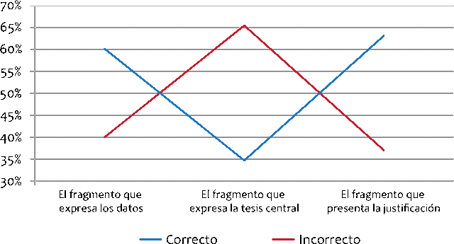 La Figura 1 muestra que el 60% de los estudiantes tienen claridad en dónde están los datos en un fragmento de texto y el 63% dónde se ubica la justificación de este, pero no dónde está la tesis central. El semestre o el género no mostraron dependencia con ninguna de las tres preguntas realizadas en este ítem (valores P = 0,115 o mayores).