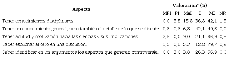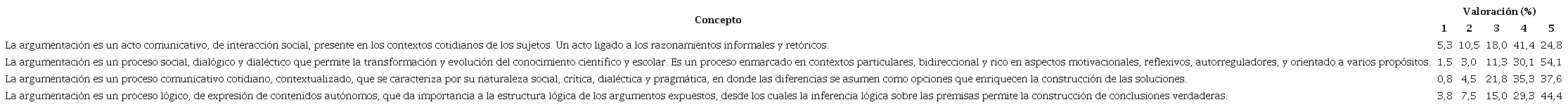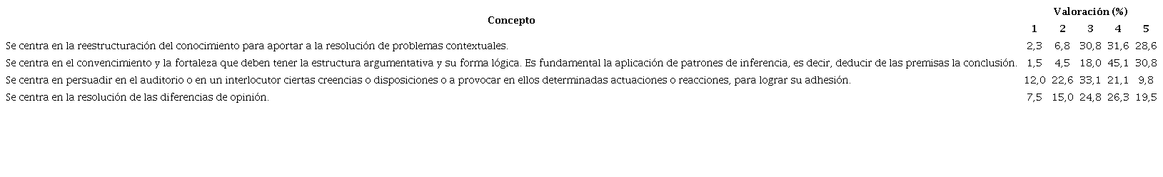 Para el objetivo de la argumentación, al igual que lo realizado para el concepto, al sumar las dos últimas columnas se observa que las afirmaciones con mayor porcentaje de alta valoración (4 y 5) son dos intencionalidades totalmente opuestas: la argumentación para la reestructuración del conocimiento (articulada a la perspectiva epistémica) y la argumentación para el convencimiento (vinculada a la perspectiva formal), con valores del 60,2% y 75,9%, respectivamente. La primera está apoyada en el desarrollo de procesos comunicacionales que incorporan el reconocimiento de los aspectos socioculturales de los sujetos y sus saberes (Jiménez, 1998; Ruiz, Tamayo y Márquez, 2015) y es, desde nuestra perspectiva, la intencionalidad que ayudaría a la reconstrucción del conocimiento en el aula. La segunda, apoyada en la estructura rigurosa de los argumentos, como elemento central que garantice el convencimiento, desconoce los elementos contextuales de los escenarios de debate.