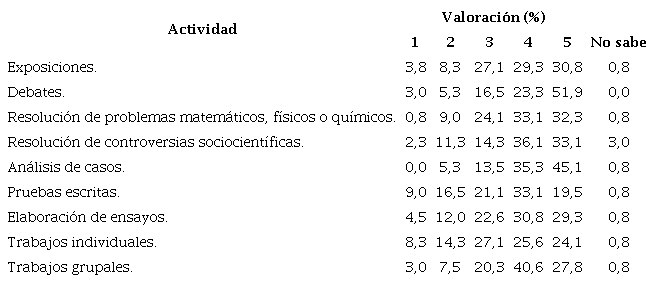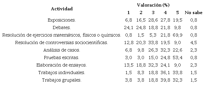 Al sumar las valoraciones más altas en las Tablas 4 y 5, se encuentra que 91,7%, 78,2% y 72,2% de los estudiantes consideran que la resolución de problemas, las pruebas escritas y los trabajos grupales, son las actividades más presentes en las clases, mientras que la resolución de controversias sociocientíficas, los debates y la elaboración de ensayos no constituyen una tercera parte de tales las actividades. Y, al analizar las actividades que consideran más pertinentes para desarrollar la argumentación, aparecen los debates, trabajos grupales y resolución de controversias sociocientíficas como las más necesarias. O sea, que únicamente hay coincidencia en los trabajos grupales, como una actividad necesaria y que se esté realizando.