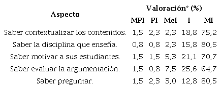 Cuando se analiza al docente en cuanto al reto de desarrollar argumentación en el aula, cuando menos el 78,9% de los estudiantes considera que todos los aspectos evaluados son importantes o muy importantes, en particular, saber la disciplina que se enseña (Tabla 6). Entre el semestre y el aspecto evaluado se encontró independencia estadística (valores P mayores de 0,222), así mismo entre este último y el género del estudiante (valores P de 0,366 o mayores), con excepción del caso en que para las mujeres es más importante que el docente sepa evaluar la argumentación que para sus compañeros hombres (valor P = 0,028).