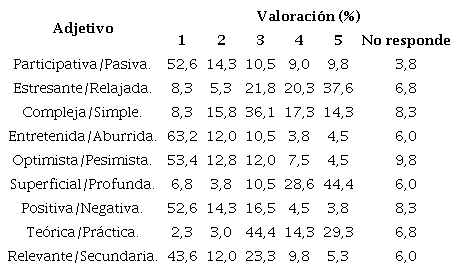 Cuando se solicitó al estudiante ubicarse en el rol del docente para promover la argumentación en clase de ciencias, valorando dos adjetivos (1 se acerca más al adjetivo de la izquierda, 5 se acerca más al de la derecha), se encontró que prefieren clases participativas (52,6%), relajadas (37,6%), entretenidas (63,2%), optimistas (53,4%), profundas (44,4%), positivas (52,6%), prácticas (29,3%) y relevantes (43,6%). Mientras que en la complejidad se ubican en un término medio (Tabla 8); así mismo, se encontró que en general todos los estudiantes prefieren las clases prácticas, pero los de semestres intermedios prefieren las teóricas (valor P = 0,036). El género no es dependiente de ninguna de las respuestas mostradas en la Tabla 8 (valores P de 0,127 o mayores).