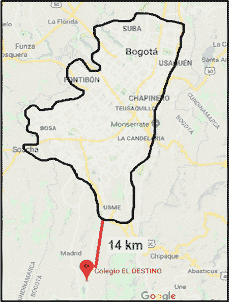 Precisamente, uno de los objetivos de la presente investigación consistió en auscultar los trazos históricos de una de estas instituciones y así reconocer el rostro de sus desafíos más latentes (particularmente desde la óptica de los procesos expansivos de la ciudad hacia la periferia rural). La institución educativa distrital (IED) El Destino, adscrita a la Secretaría de Educación de Bogotá, está ubicada en zona rural de la localidad de Usme, sus instalaciones se sitúan a 14 kilómetros del centro urbano y su única vía de acceso es la carretera que desde el pueblo de Usme conduce a San Juan de Sumapaz (Figura 1). Actualmente, ofrece todos los grados del nivel básico y medio, articulados a una formación con énfasis técnico-agropecuario.