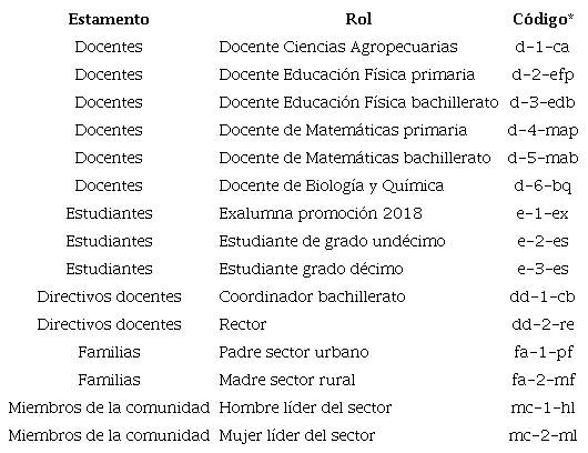 De manera paralela y producto de las observaciones en curso, se revisaron dos documentos institucionales: el proyecto educativo institucional rural (PEIR) y el acuerdo de ruralidad pactado con la Secretaría de Educación entre los años 2014 y 2016. Igualmente, se llevaron a cabo un total de 15 entrevistas individuales semiestructuradas con miembros de los diferentes estamentos de la comunidad educativa (Tabla 1). Adaptando los parámetros de Adams (2015), el enfoque de las conversaciones se planteó en dos etapas: en la primera se abordaron tópicos generales, según cada estamento, sobre el impacto de los procesos expansivos de la ciudad en las dinámicas comunitarias y escolares; en la segunda, por su parte, se profundizó en algunos aspectos que comenzaron a configurarse como concepciones de sentido común sobre el objeto de estudio (configuración de la territorialidad escolar, tensiones entre lo urbano y lo rural y práctica reflexiva del maestro rural).