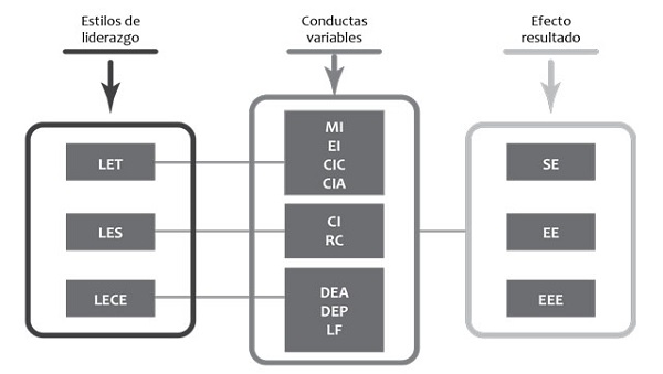 Satisfacción, efectividad y esfuerzo extra (S, E, EE). Son variables relacionadas con el impacto del liderazgo y miden la incidencia de las conductas del líder. La primera noción está relacionada con la forma como el líder logra llenar las expectativas y necesidades de los seguidores. La efectividad se refiere al alcance de resultados óptimos, producto del buen manejo de los recursos y procesos. Finalmente, con el esfuerzo extra se logra que el equipo alcance los resultados, metas y objetivos y se superen las expectativas.