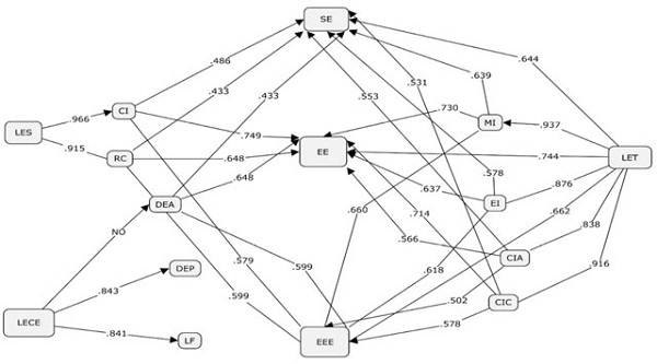 En la Figura 2 se describen los índices de correlación entre las variables del modelo. Vemos que existe una correlación fuerte y significativa entre variables de segundo orden y la correspondiente variable de primer grado (estilos de liderazgo), excepto entre el LECE y la variable DEA. Es de aclarar que la variable DEA se comporta como una conducta positiva en la docencia, mientras las demás variables del LECE son conductas pasivas o de ausencia de liderazgo. También se aclara que todas las preguntas de la variable DEA se correlacionaron con dicha variable. Por último, la correlación con las variables de resultados también es significativa; por ejemplo, la correlación entre la variable MI y la EE es de 0,730, lo cual indica un alto nivel de asociación o relación entre la motivación inspiracional de los docentes y el esfuerzo extra de los educandos. Para la IE2 los índices de correlación son similares a los de la IE1.