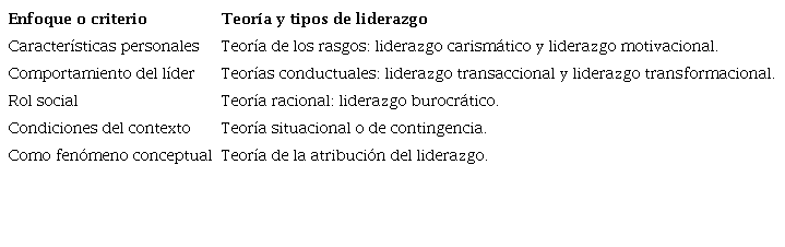 Se pueden encontrar diferentes teorías, enfoques o perspectivas de estudio y distintas tipologías de liderazgo, sin que las descritas en la Tabla 1 constituyan los únicos tipos que los estudiosos han abordado, pues también se hace referencia al liderazgo distribuido, al burocrático y al democrático o participativo. Además, la aparición de nuevas complejidades hace que dichas teorías no sean suficientes para explicar la dinámica del liderazgo (Hurtado, 2019). Por último, debemos señalar que el liderazgo se ha analizado en diferentes escenarios: religioso, político, militar, económico y educativo, entre otros.
