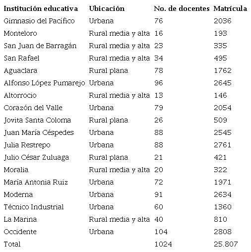 El municipio de Tuluá cuenta con 18 instituciones educativas oficiales. De ellas, 9 son urbanas y 9 rurales, y de estas, 6 están ubicadas en media y alta montaña. En la Tabla 2 se describe el número de estudiantes y docentes de estas instituciones. El estudio se realiza en las instituciones educativas Monteloro (IE1) y San Rafael (IE2). La primera tiene una población de 193 estudiantes y 16 docentes y la segunda cuenta con 495 educandos y 34 docentes. Los indicadores escolares de cobertura y deserción presentan un comportamiento positivo, pues en los tres últimos años ambas instituciones han mantenido o mejorado la cobetura, y la deserción escolar es mínima, comparada con la del municipio, incluso en épocas de estudio en casa por pandemia.