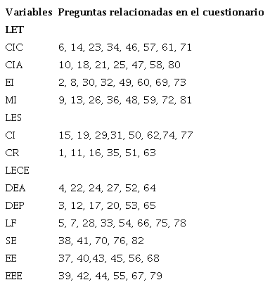Para la medición o evaluación de las 15 variables que componen el modelo meled, en el cuestionario de liderazgo educativo docente (CLED), tanto para estudiantes como para docentes, cada pregunta está dirigida a medir uno u otro elemento o variable del modelo. En la Tabla 3 se relacionan dichos elementos o variables y el número o los números de las preguntas que les corresponden en el cuestionario.