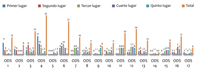 La Figura 1 muestra que el ODS más mencionado, después del 4 "Educación de calidad", es el 6 "Agua limpia y saneamiento", seguido por el 12 "Producción y consumo responsable", el 11 "Comunidades y ciudades sostenibles" y, finalmente, el 3 "Salud y bienestar".