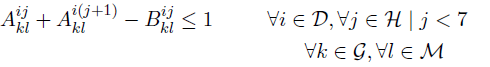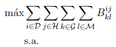 (11)La función objetivo 1 maximiza la cantidad de bloques que se puedan formar durante la semana. Las restricciones 2 a 4 permiten que se asigne una materia en cierta hora sin necesidad de que sea un bloque, pero asegura que si dos horas consecutivas en el mismo grupo tienen la misma materia entonces el marcador