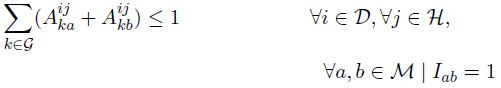 , y además, que cada materia no se dicte más de dos horas en el mismo grupo durante un día. Es necesario también que en cada instante de tiempo una materia se asigne a un único grupo, de la misma forma que a un grupo sólo se le debe asignar una única materia en cada momento, estas condiciones son expresadas en las restricciones 7 y 8. Sucede además, que algunas materias no pueden asignarse en el mismo instante aún si fuese en diferentes grupos ya que son dictadas por el mismo sujeto, lo cual se condiciona en la expresión 9, mientras que la restricción 10 asegura que las materias se asignen únicamente en las horas que no presenten incompatibilidad con la disponibilidad del docente encargado de dictar esa materia. Por último, la expresión 11 indica que el marcador de bloques para la hora 7 debe valer cero ya que por ser la última hora no puede tomar otro valor.