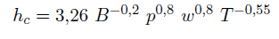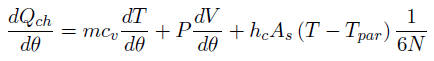 (9)Donde dQch=d θ es la tasa de liberación de calor calor liberado, cv es el calor específico a volumen constante, As el área de transferencia de calor en una posición angular determinada, N el régimen de giro en el motor y Tpar la temperatura de paredes del cilindro. hc es el coeficiente convectivo promedio, el cual se calculó a partir de la correlación propuesta por Woschni 6, presentada en la Ecuación (10).