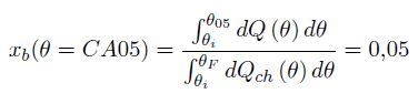 2.4.1 Duración de la combustión El proceso de combustión solo dura una pequeña fracción del ciclo termodinámico, por eso es necesario definir los instantes en los cuales inicia y finaliza la combustión. Existen diferentes técnicas para estimar estos instantes a partir del valor de gradientes de la presión en cámara o variables como la tasa de liberación de calor. En la metodología se definió el inicio de la combustión como el CA05, Ecuación (11), ya que este criterio no depende del tipo de tecnología sino del desarrollo temporal del proceso de combustión en sí y es robusto frente a los efectos del ruido de la señal de presión.
