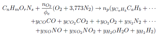 (2)Al ser el aire el flujo de mayor presencia durante el proceso de combustión, la correcta medición de este parámetro está asociada a la calidad de información de los balances de energía desarrollados. Sin embargo este parámetro no se mide cerca del múltiple de admisión lo cual posibilita las infiltraciones de aire y por ello una sobre-estimación de este. Con el fin de constatar la correcta medición de este flujo y a su vez garantizar análisis confiables de la operación y desempeño del motor se incorporó el cálculo del dosado relativo a partir de las emisiones contaminantes (1),(12). Para el cálculo se define una composición molar equivalente del combustible que se está ingresando. La Ecuación (3) muestra el balance general de masa para las emisiones medidas en el celda y los elementos presentes en los combustibles gaseosos.