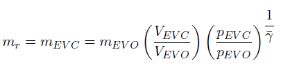 es la relación de calores específicos promedio, a partir de las temperaturas en EVO y EVC. m, V y p es la masa, volumen y presión, respectivamente, en el punto de interés durante el ciclo. La implementación de este método requiere de un proceso iterativo para determinar condiciones iniciales en EVC, para lo cual se usó la Ecuación de estado de gases ideales, asumiendo que la temperatura en este punto es aproximadamente igual a la temperatura de los gases de escape. En el proceso se usó una tolerancia igual a la incertidumbre del medidor tipo coriolis. La masa residual se suele presentar como porcentaje en relación con la masa total atrapada (RGF) durante el período de válvulas cerradas, Ecuación 8.