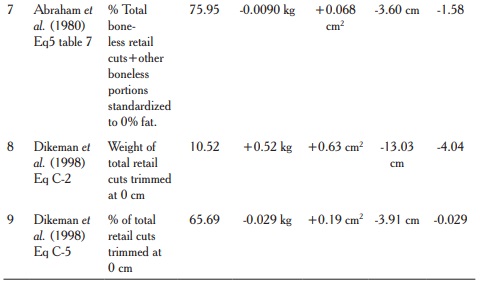 Therefore, in applying previously published equations for cutability into a Mexican beef population (table 3), authors were aware of the theoretical objections referred above as far as their application into different conditions. Nevertheless, in an attempt to eliminate the speculative dose of such assumptions, the predictable outputs of available equations were tested versus observed values, allowing the results to speak by themselves (tables 3 and 4).