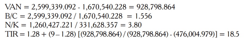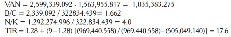 En el caso de la nuez el B/C = 1.662, expresa que, durante la vida útil del proyecto, a una tasa de actualización del 1.28 %, por cada peso invertido se obtendrá 0.662 pesos de beneficio. Como la relación es mayor que 1, cumple con el criterio de selección y evaluación, indicando que el proyecto es viable y rentable.