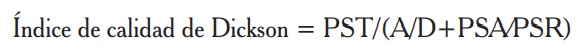 A partir de las variables altura, diámetro, peso seco aéreo y radicular de la planta, se estimó la relación parte aérea/raíz, el índice de esbeltez y el índice de calidad de Dickson. La relación parte aérea/raíz se estimó como el cociente entre el peso seco aéreo (g) y el peso seco radical (g) (Thompson, 1985). El índice de esbeltez se calculó mediante el coeficiente de la altura y el diámetro del tallo (Toral, 1997). El índice de calidad de Dickson (ICD) resultó de integrar los valores de peso seco total, e índice de esbeltez y la relación parte aérea/raíz (Dickson et al., 1960).