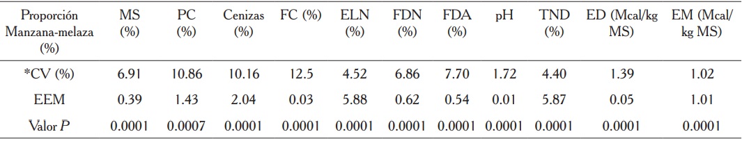 El proceso de ensilado conlleva pérdidas importantes en el contenido de MS y de nutrientes en los diferentes tratamientos (cuadro 2). Se observó un decremento significativo en el contenido de MS conforme se incrementó la proporción de manzana en las mezclas; el valor más bajo se obtuvo en el tratamiento 75-0 manzana-melaza (13.2±1.22 % MS). Lo contrario ocurrió al aumentar la proporción de melaza; ya que, se observó un aumento significativo de esta variable, obteniéndose los valores más altos en las mezclas con 10 % de melaza.