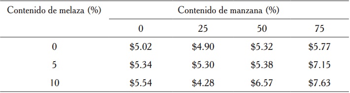 Por otro lado, a mayor contenido de melaza se debería obtener un mayor costo de la mezcla, debido al precio de este aditivo. No obstante, la formulación de 25:10 manzana-melaza alcanzó una combinación óptima de materia seca y digestibilidad, por lo cual se obtuvo también el menor costo de producción de los ensilados ($4.28/kg MS digestible).