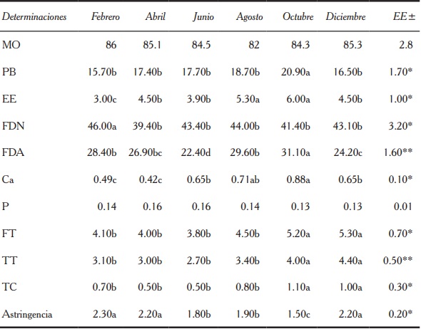 En lo referente a la fracción de compuestos fenólicos, los FT presentaron los mayores valores durante los meses de octubre y diciembre (5.30 ± 0.07 %), sin variaciones para el resto del año (4.10 ± 0.29 %). Los TT presentaron un comportamiento similar, incrementándose (P<0.01) durante octubre y diciembre en un 35.50 % con relación al resto del periodo (3.10 ± 0.29 %). La mayor astringencia en el follaje se registró de diciembre a abril (2.20 ± 0.06 g Eat/100 g MS), con pocas variaciones para los otros muestreos (1.70 ± 0.21 g Eat/100 g MS).