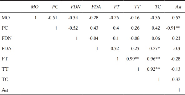 En el cuadro 2, se observa que hubo una correlación entre las fracciones de fenoles evaluadas (P<0.01), mientras la PC presentó una relación negativa con la astringencia, sin asociación entre la presencia de compuestos fenólicos y su capacidad de precipitar proteínas.