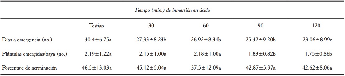 En conclusión, el tiempo de inmersión en ácido no afectó el porcentaje de emergencia y fue inversamente proporcional al promedio de días a emergencia. El número de plántulas emergidas es mayor en el testigo y disminuye conforme el tiempo de inmersión de la semilla en ácido es mayor. Por tanto, es recomendable usar la semilla sin tratamiento ácido.