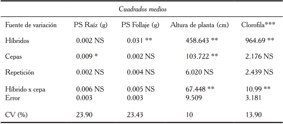 El ANVA global detectó diferencias altamente significativas para los híbridos (30P49® y 30F52®) en el peso seco de planta, altura de planta y clorofila (cuadro 1). El mismo análisis muestra que entre cepas existen diferencias significativas en cuanto a su efecto en peso seco de raíz y altamente significativas para altura de planta. No muestran efecto en cuanto a la influencia en el índice de clorofila, ni en el peso seco de planta. Asimismo, el ANVA no detectó diferencias significativas en las repeticiones, lo cual significa que hay homogeneidad entre ellas.
