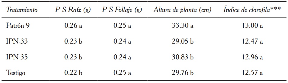 En el experimento, cada una de las cepas bacterianas indujo cambios en la planta, los cuales pueden tener variaciones de acuerdo con la actividad de la misma (cuadro 2). Los tratamientos de las semillas de maíz con la cepa Patrón 9, mostró los valores promedio más altos para peso seco de raíz y altura de planta comparado con las otras cepas y el testigo, sin diferencia estadística para peso seco de follaje (parte área de la planta) y al índice de clorofila.