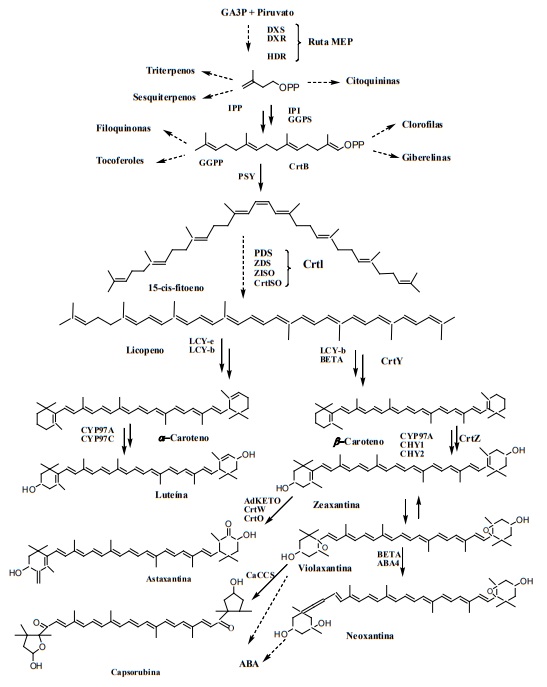 Específicamente, los carotenoides son sintetizados a partir de cuatro moléculas de isopentenil pirofosfato (IPP) y una de C5 prenilfosfato que, a su vez, es sintetizada en los plástidos por la ruta de 2-C-metil-D-eritritol 4-fosfato (MEP). Se ha demostrado que los patrones de expresión de transcritos y proteínas de la ruta MEP, se acumulan principalmente en tejidos fotosintéticos y durante el desarrollo temprano de la plántula.