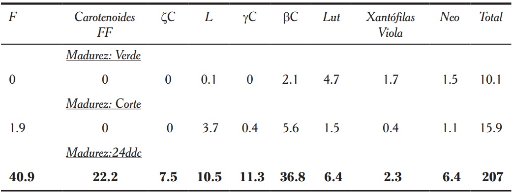 Por otra parte, en frutos de estadio maduro los niveles máximos de carotenoides totales y licopeno se encuentran en los tejidos más externos como el exocarpo y mesocarpo, disminuyendo considerablemente la concentración de estos pigmentos en los tejidos más internos, como columela y mucílago (López-Casado et al., 2003).