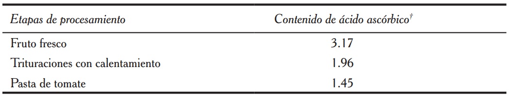 En el cuadro 2 se comparan los contenidos de ácido ascórbico en fruto fresco y en etapas correspondientes al procesamiento del tomate, donde las trituraciones con calentamiento (“hot-break”) y evaporación al vacío producen pérdidas del 38 % y 16 %, respectivamente.