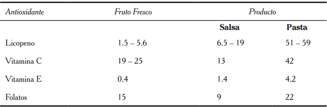 En el cuadro 3, se presentan los diferentes contenidos de antioxidantes, como licopeno, vitaminas C y E y folatos, en productos como salsa y pasta de tomate con relación a los alcanzados en fruto fresco (Riso et al., 2004).