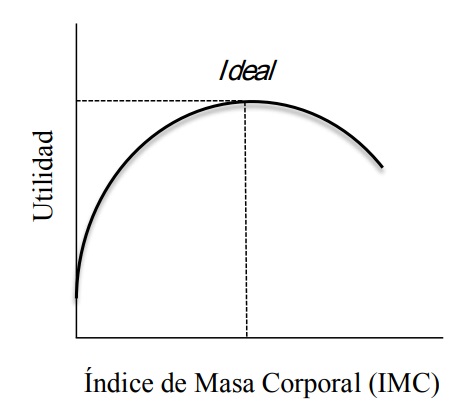 En los modelos económicos sobre obesidad, el peso de los individuos entra en la función de utilidad como una variable que afecta su bienestar. La función de utilidad tiene la forma de una U invertida con respecto al Índice de Masa Corporal (IMC), ya que los individuos podrían experimentar des-utilidad si su peso está por encima o por debajo del peso “ideal” o en el nivel preferido (gráfica 1).