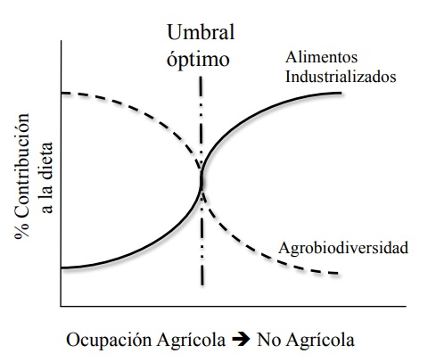 Hay un umbral óptimo (gráfica 2) entre la complementariedad nutricional en el aporte de la dieta de los alimentos que provienen de la agrodiversidad y los alimentos industrializados; este umbral óptimo se rompe cuando uno de los dos grupos predomina más en la ingesta de los individuos.