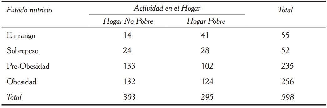 El cuadro 9 reporta el análisis entre la condición de pobreza y el estado nutricio de los habitantes, aplicando la prueba Pearsons Chi-cuadrada; el resultado es estadísticamente significativo: r = 0.000, lo que sugiere rechazar la H0, y aceptar la hipótesis alternativa HA, sobre la dependencia entre la condición de pobreza extrema y el estado nutricio.