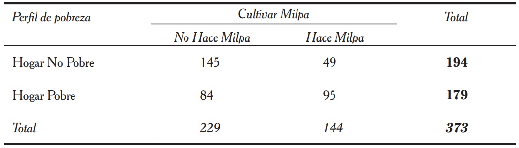 El cuadro 10 muestra el resultado estadísticamente significativo para la prueba Pearsons Chi-cuadrada, r = 0.000, sobre la dependencia en la relación de ser pobre y cultivar Milpa, resultados que reafirman aún más la evidencia de la vida y dependencia.