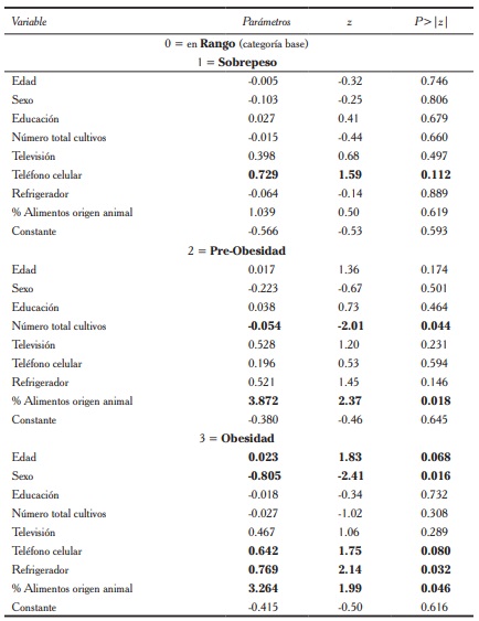El análisis empírico sobre los factores sociales y económicos que explican el estado nutricio de los habitantes rurales > a 19 años de edad se reporta en el cuadro 11. Donde la variable dependiente . que puede tomar uno de cuatro valores del IMC: 0, 1, 2, y 3; cada categoría corresponde a un estado nutricio específico.
