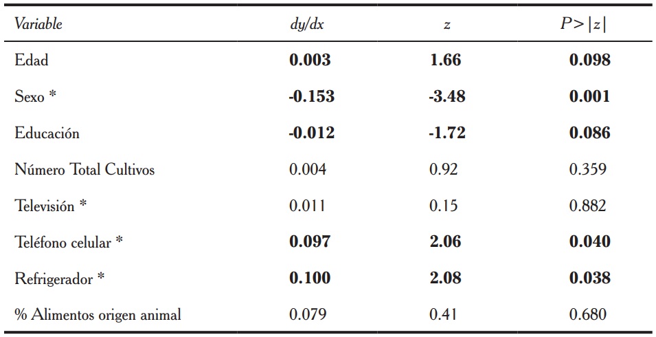 Los parámetros del modelo de regresión, a pesar de que éstos resultan difíciles de interpretar, los signos no lo son, siendo relevante el nivel de significancia. Destacan los resultados de la variable número total de cultivos; lo que sugiere que una mayor variedad en la producción agrícola del hogar conlleva a una disminución en la probabilidad de presentar un peso superior al rango.
