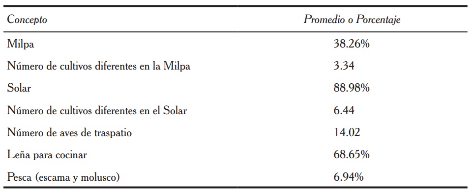 En el cuadro 1, se reportan las generalidades de la actividad agrícola: Milpa y Solar que desempeñan los hogares. De los hogares, 38 % reportaron cultivar milpa, con un promedio de 3.34 cultivos diferentes: maíz, frijol y calabaza. Asimismo, 88 % declaró tener solar, con un promedio de 6.44 cultivos. En promedio, reportaron 14 aves de corral. Un 68.65 % mencionaron usar leña como energético para cocinar. Y 6.94 % reportaron realizar pesca.