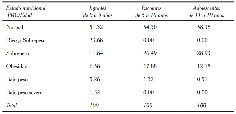 El cuadro 2 ilustra las características generales del estado nutricio de infantes y adolescentes. 48 % de los infantes presentan algún problema en la dualidad de riesgo de sobrepeso y el bajo peso severo. Mientras que los otros dos grupos de edad, alrededor del 40 %, presentan un problema de sobrepeso y obesidad.