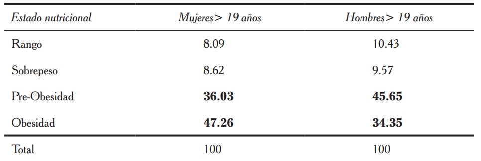 El cuadro 3 muestra los resultados para mujeres y hombres adultos, donde cinco de cada 10 mujeres presentan un problema de obesidad; mientras que para los hombres tres de cada 10 presentan un nivel de obesidad.